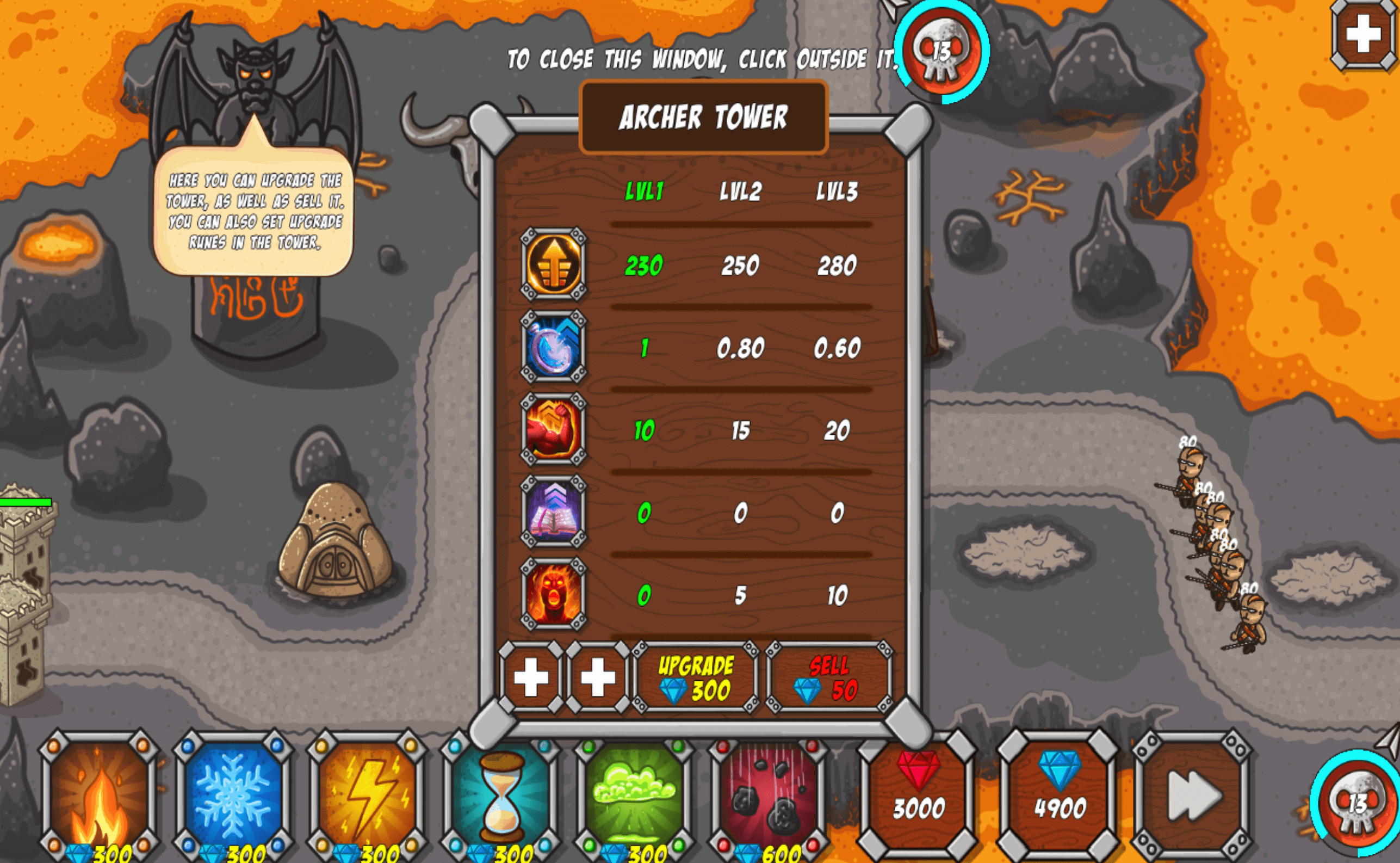 The last tower doesn’t reach enemies that manage to get to the fortress. Not sure if that’s a bug or a feature, but if a boss gets through, it’s basically GG. Skills deal tiny amounts of damage, and to take 200–300 HP off a boss, you’d have to cast them about 10 times each.